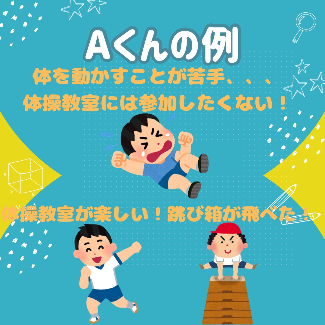 訪問を始めた当初は出来なくて泣いてしまう場面も多く、体操教室はとても嫌な時間でした…💦ですが、訪問を初めて1ヶ月が過ぎた頃から体操教室が楽しみになったとお子さんから話がありました😁そして、楽しみながら参加しているなかで、これまで飛べなかった跳び箱を跳べたのです‼️‼️クラスのお友達や先生も一緒に手を取り合って喜ぶ時間は最高な時間になりました✨✨