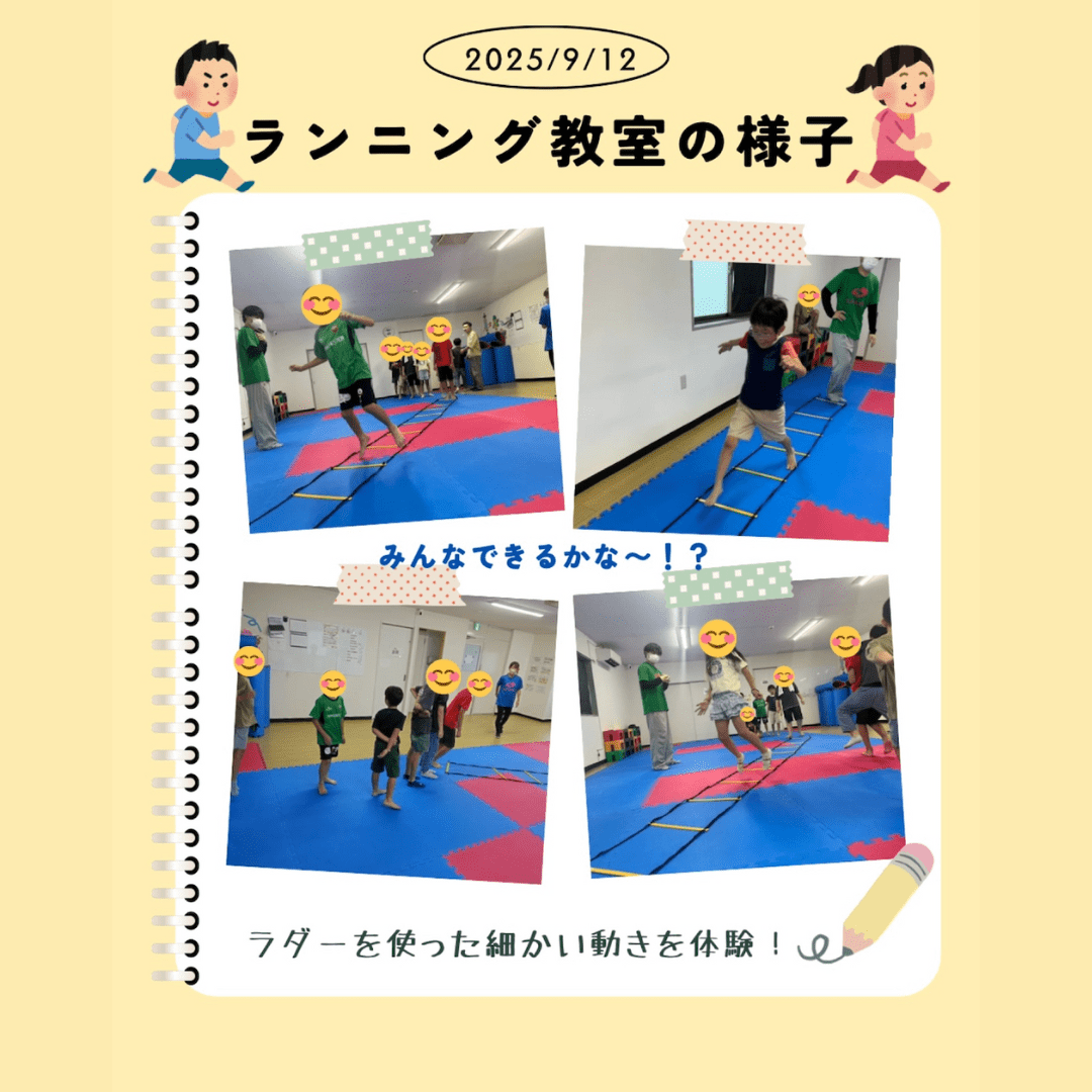 走りに重要な動きづくりをラダーという機材を使って実際に体験したり、