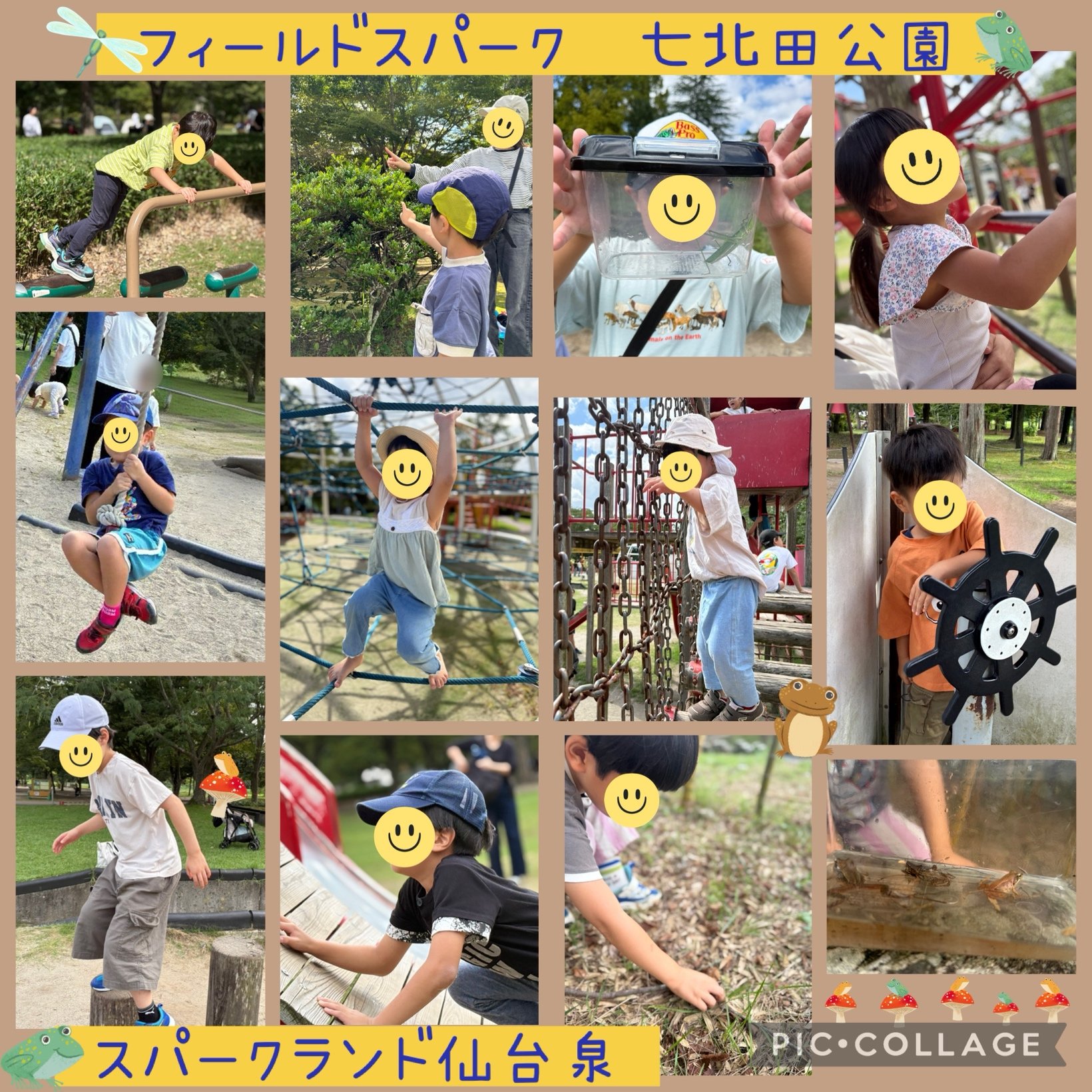 お友達と同じくらい元気なトンボやバッタ、、カエル、カマキリを捕まえたり、広い公園でたくさん身体を動かしてきました。