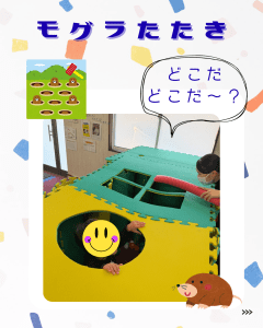 大きなマットでモグラ叩きの装置を作り、穴から顔を出して棒を持ってるスタッフとのかかわりを楽しんでいる様子です🙉