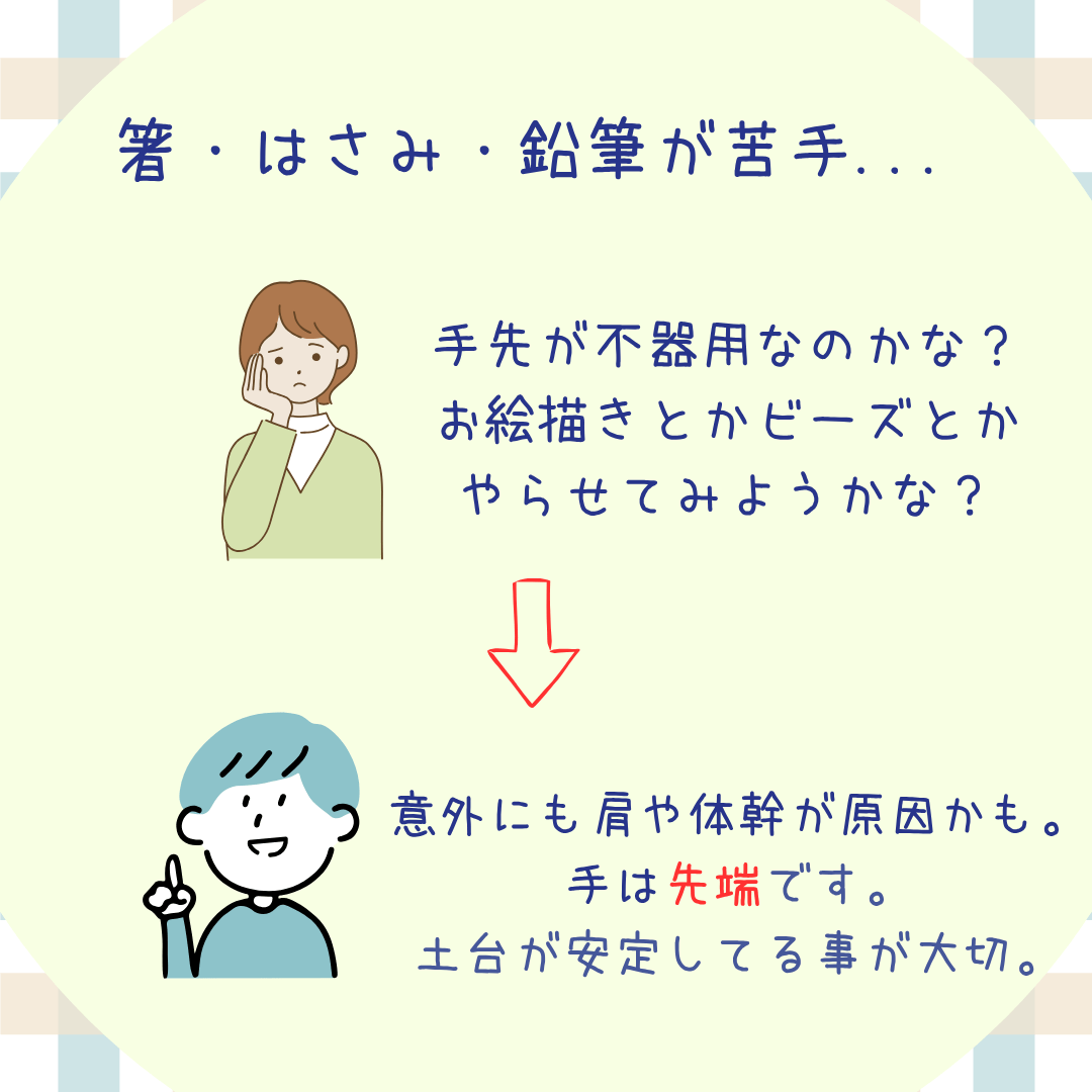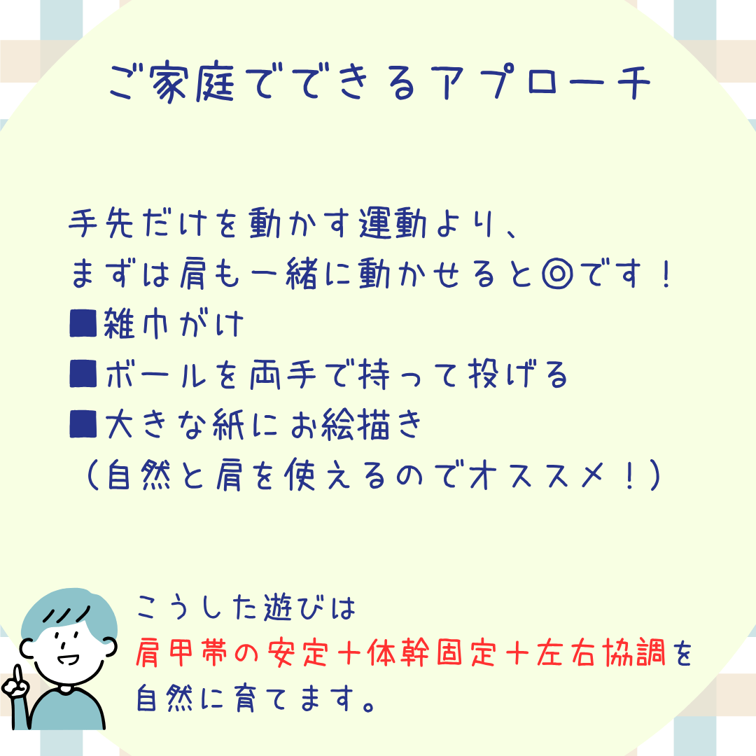 つまり、不器用さは“手先”ではなく、肩甲帯や体幹といった土台から始まっていることが多いのです。