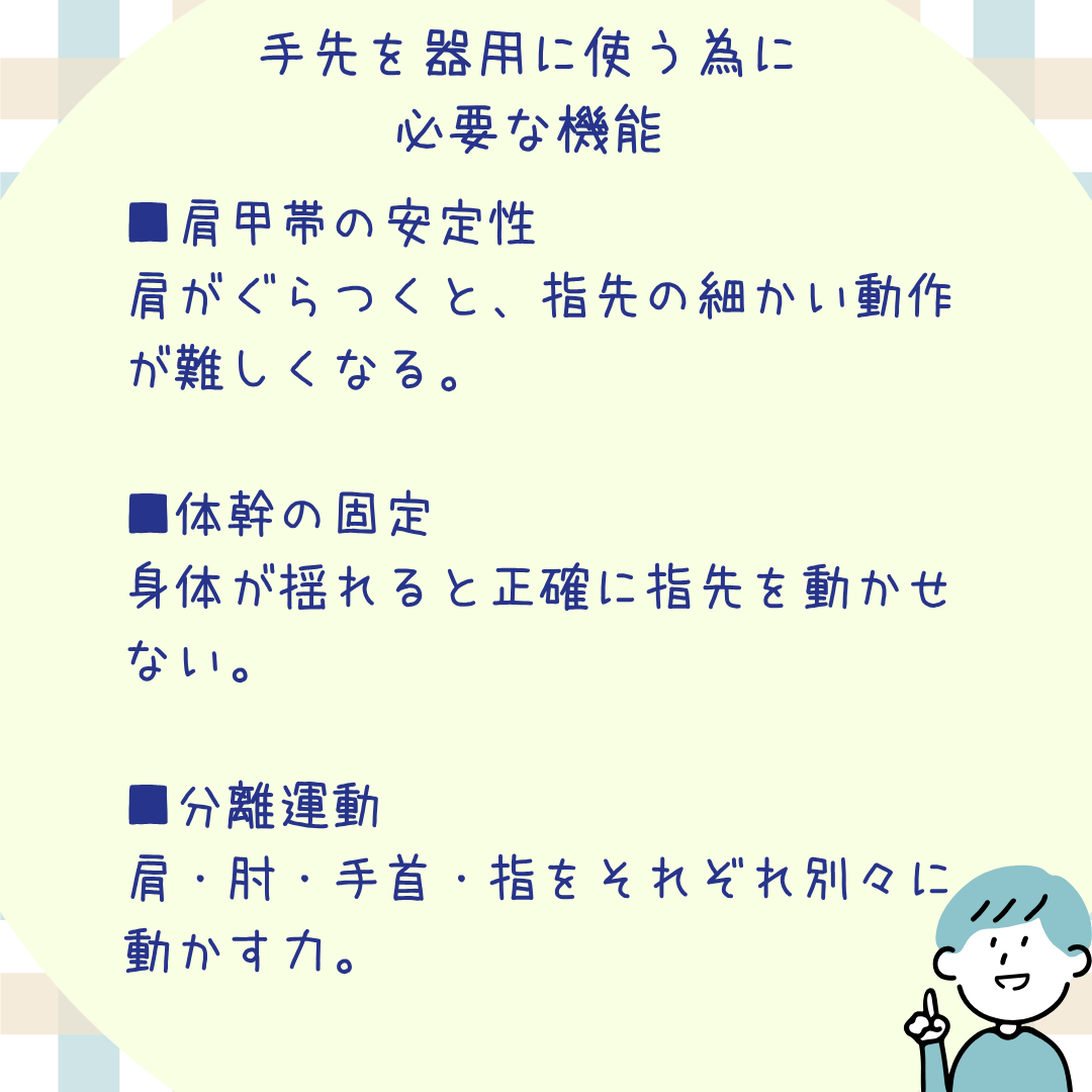 肩がぐらついたり、身体を支える力が弱いと、指先で細かな調整をすることが難しくなります。